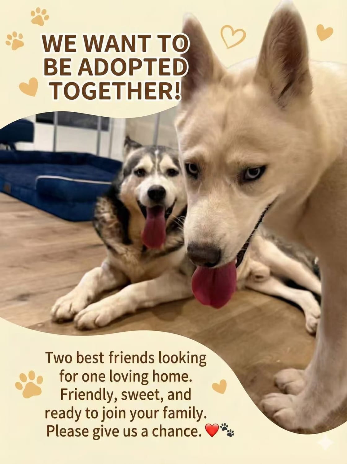 They are looking for a family willing to open their hearts and their home to both of them, honoring the connection that saved their lives.